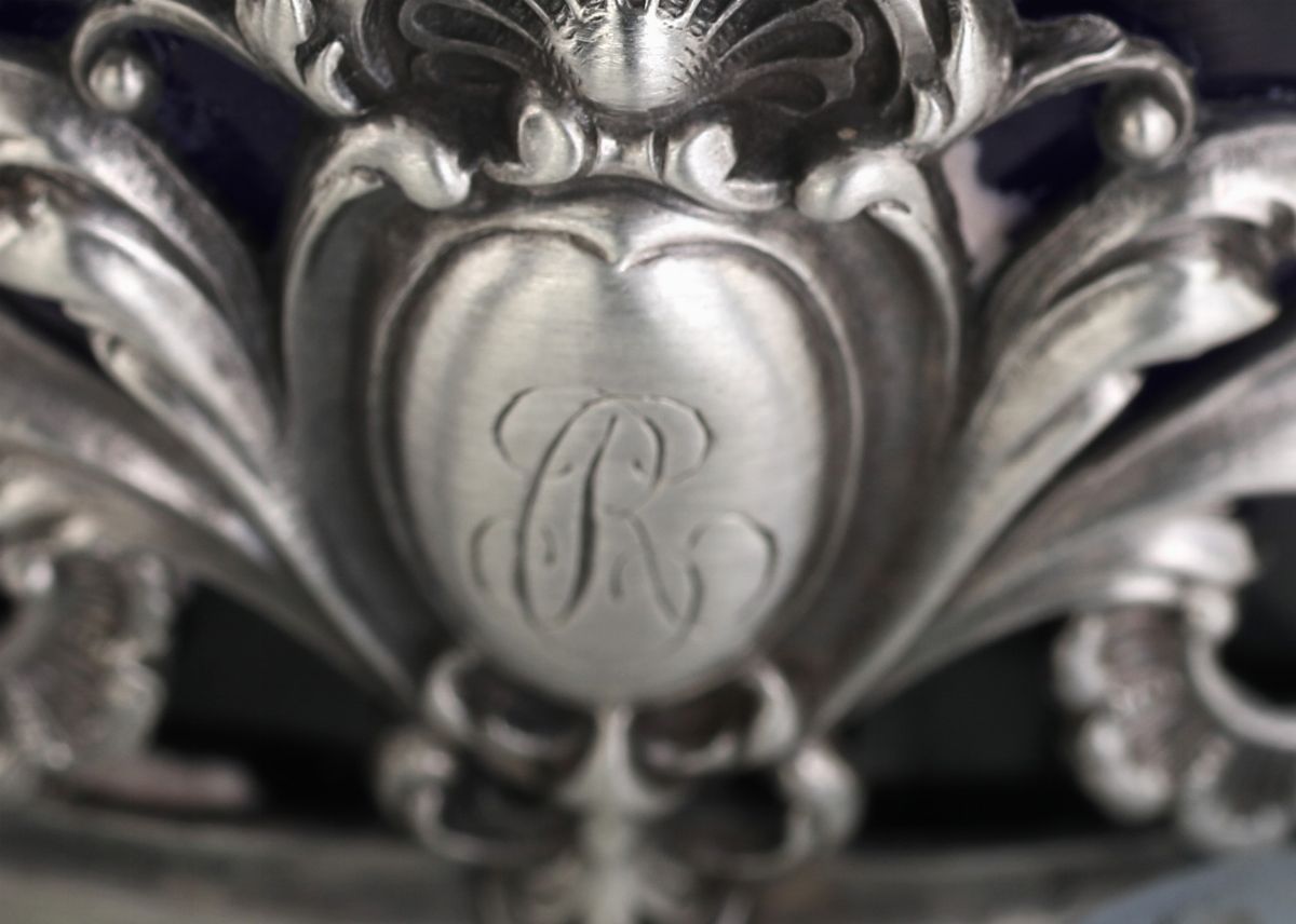 di forma ovale traforata a volute vegetali e cartigli interrotti da un medaglione con monogramma inciso; vaschetta in vetro blu, completa di cucchiaino