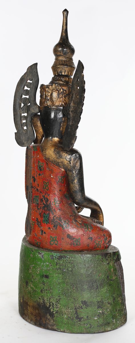 Buddha Bhumisparsha in legno policromo e dorato, Bali, Indonesia, XX secolo