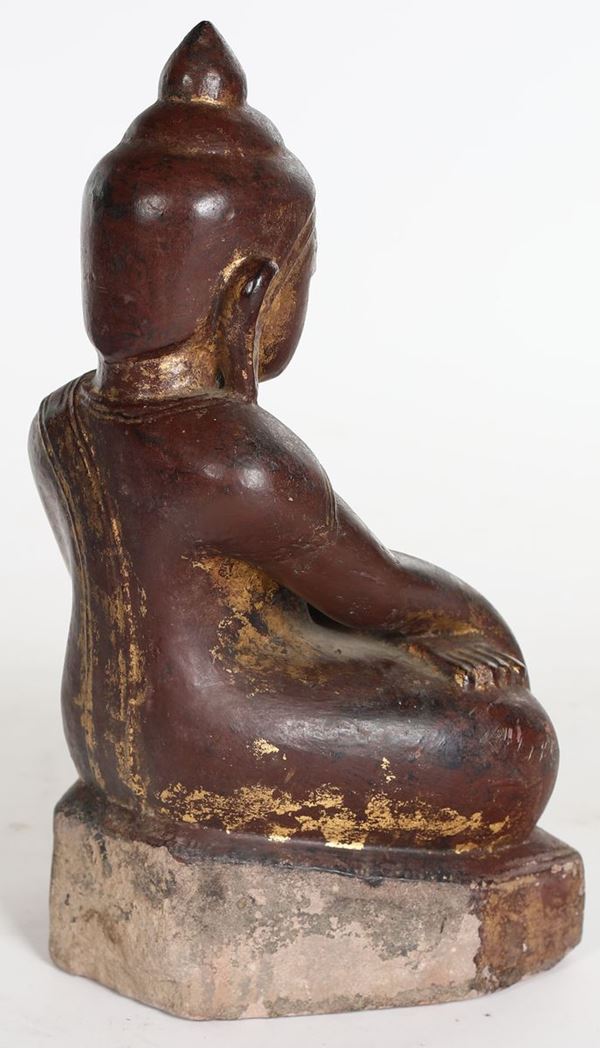 Buddha Bhumisparsha in pietra arenaria laccata in rosso e dorata, Birmania, XIX secolo