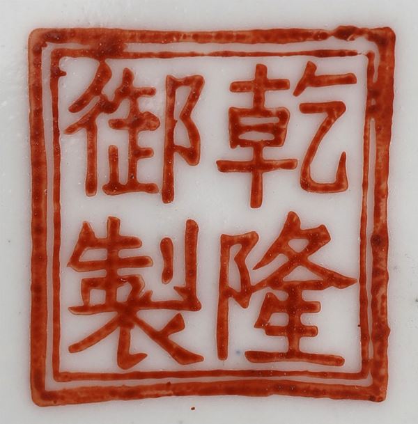 decorati da figure di pipistrello in rosso alternati a motivi stilizzati policromi; basi in legno scolpito. Marca in rosso.