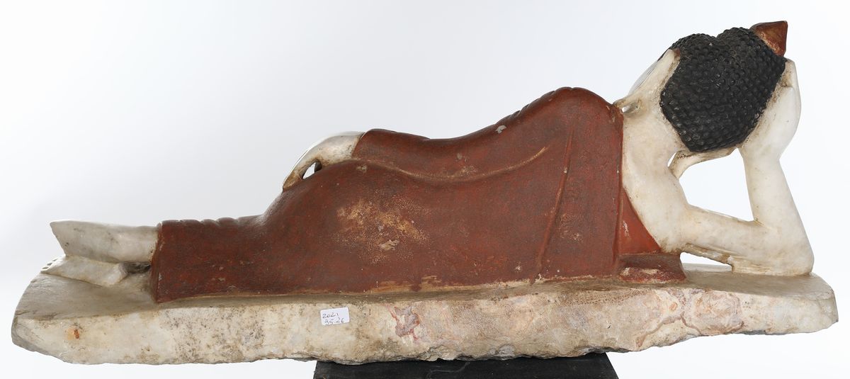 ritratto reclinato in Paranirvana con abito in lacca marrone. L'iscrizione alla base parla del donatore (U Yar Kyaw) che a suo tempo lo ha offerto al tempio