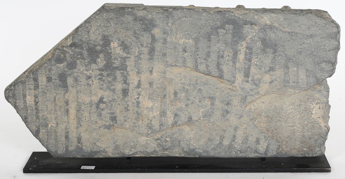 Parte di elemento architettonico (lintel) in scisto grigio scolpito in bassorilievo, area storica del Gandhara IV-V secolo