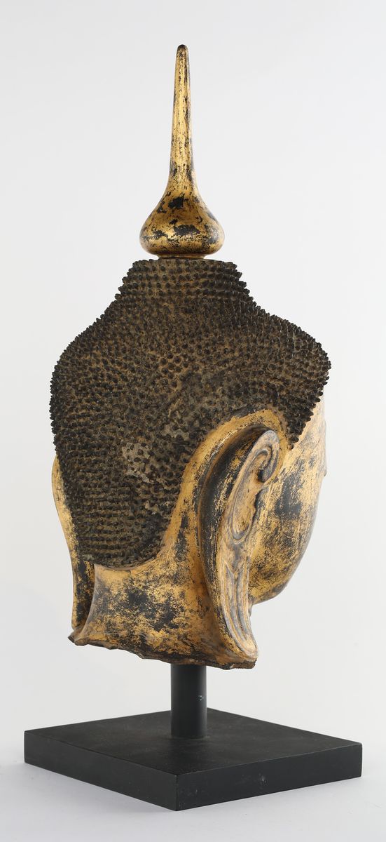 Testa di Buddha in lacca e carta pesta su stoffa, Birmania, XIX secolo