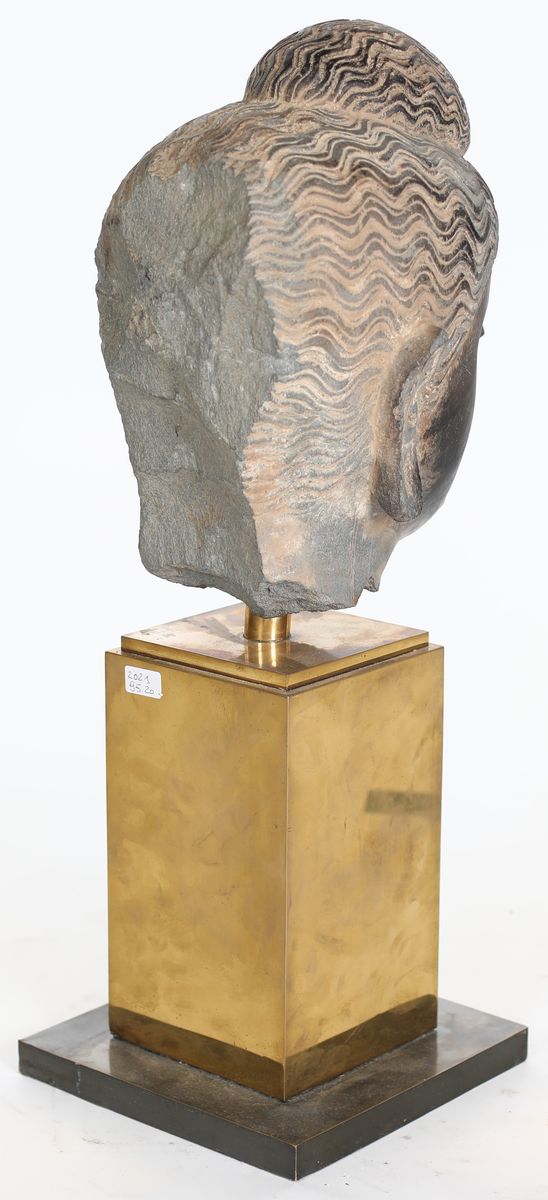 volto assorto in meditazione con capelli ondulati e voluminosi raccolti sulla sommità della testa a formare l'ushnisha. Le prime raffigurazioni dell'ushnisha nell'iconografia del periodo Gandhara erano probabilmente intese a simboleggiare una corona. Piccolo restauro al naso. Provvisto di attestato di libera circolazione