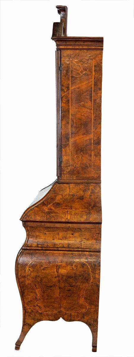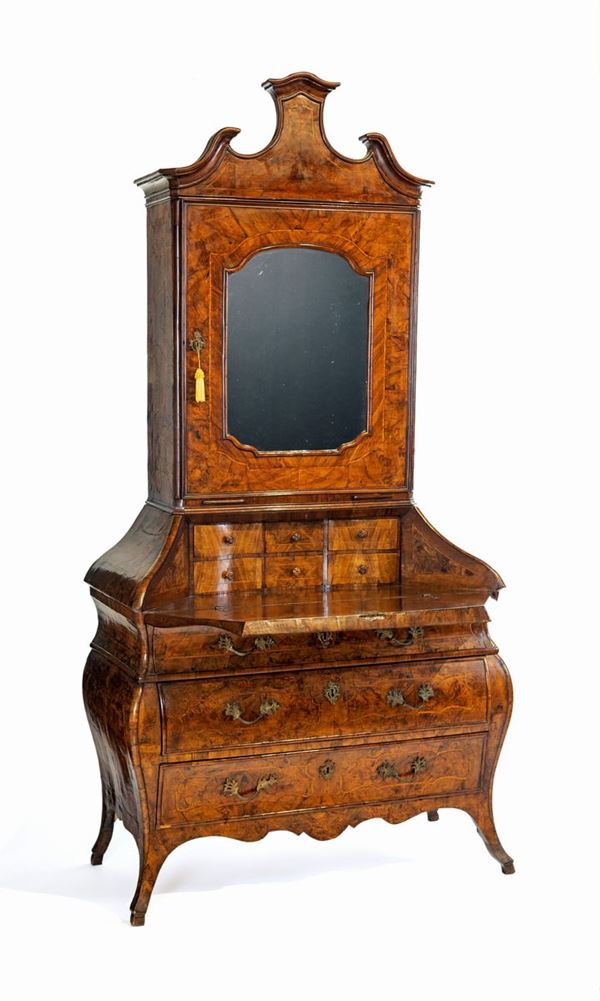 con filettature in legno di frutto poste a cornice delle varie partizioni; corpo superiore con un'anta a specchio e due tablettes estraibili, coronata da cimasa a timpano spezzato; corpo inferiore ad urna con un cassetto compreso nella fascia concava e due sottostanti separati da traversa; la ribalta ospita sei tiretti, piedi sfuggenti