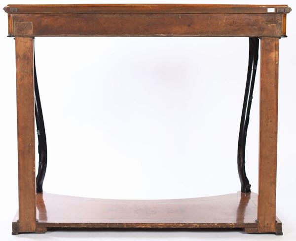 caratterizzata da sottili filettature e minuti ramages naturalistici intarsiati in legno in contrasto; piano rettangolare, montanti anteriori sagomati e posteriori a lesena su base con facciata semicircolare