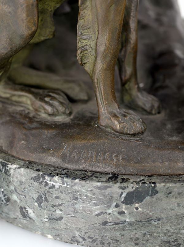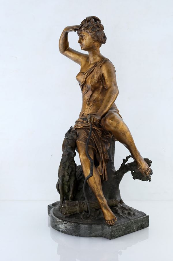 scultura in bronzo dorato e brunito raffigurante la dea della caccia affiancata da un cane, ritratta seduta a guardare l'orizzonte; supporto in marmo. Firmata Madrassi sulla base