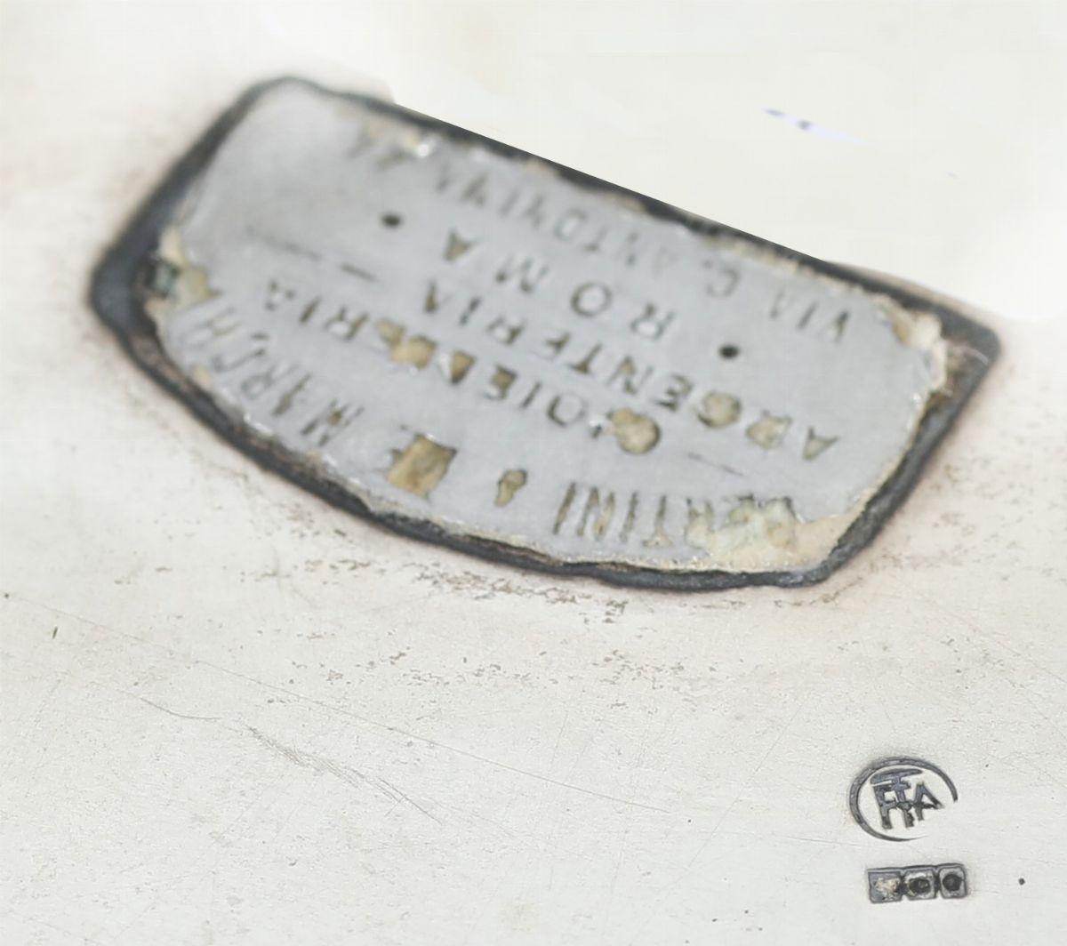 di forma circolare con profilo mosso poggiante su quattro piedi a sfera. Reca etichetta adesiva dell'Argenteria Bertini & De Marchis Roma, via della Colonna Antonina