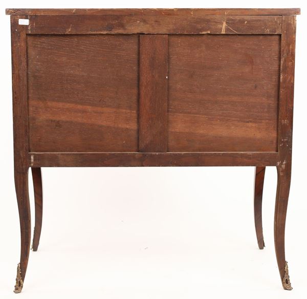 con due cassetti in colonna frontali abbelliti da maniglie in bronzo dorato; gambe lievemente sagomate