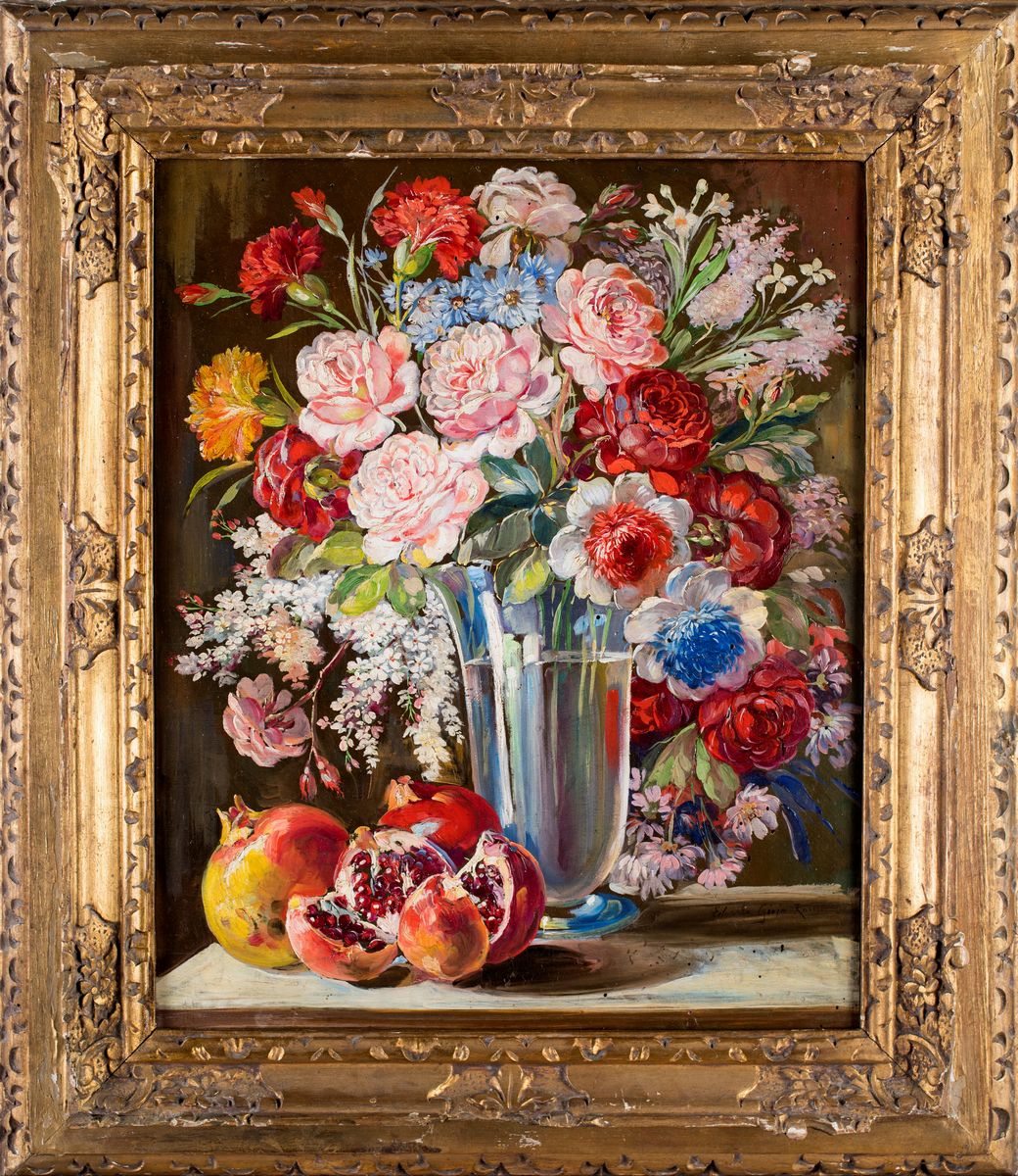 Vaso di fiori e melagrane sul piano
