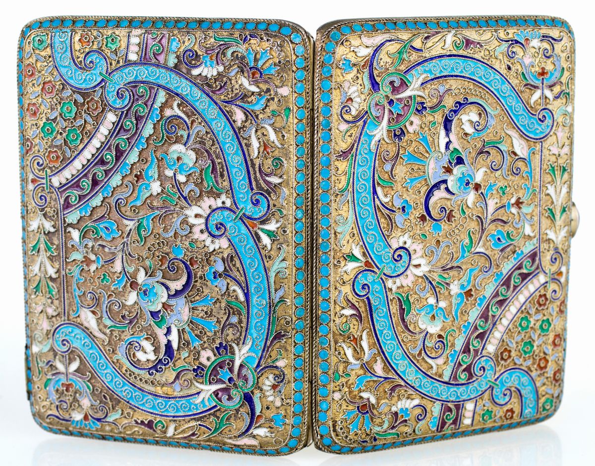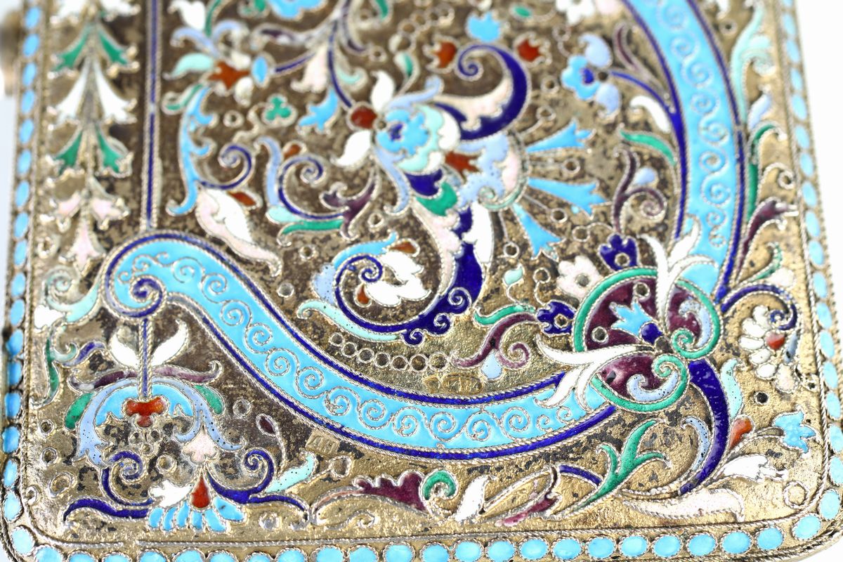 Portasigarette da tasca in argento dorato e smalti, Russia, 1908 - 1917, argentiere August Holming (attivo dal 1880 al 1915)