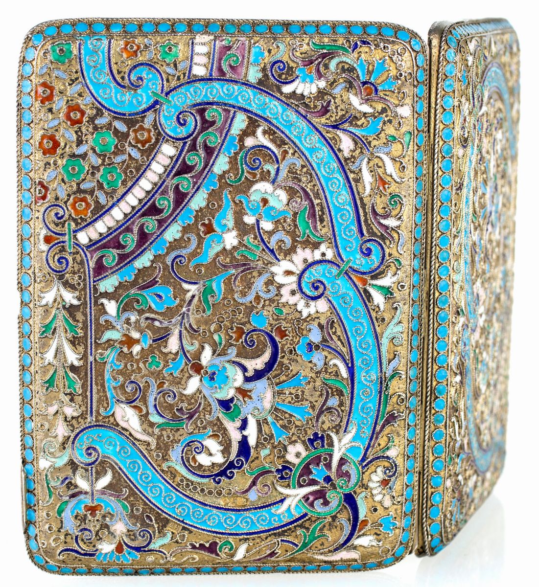 con fitta decorazione a volute vegetali, fiori multiformi e motivi circolari a smalti cloisonné; apertura a scatto con pulsante a mandorla in ametista