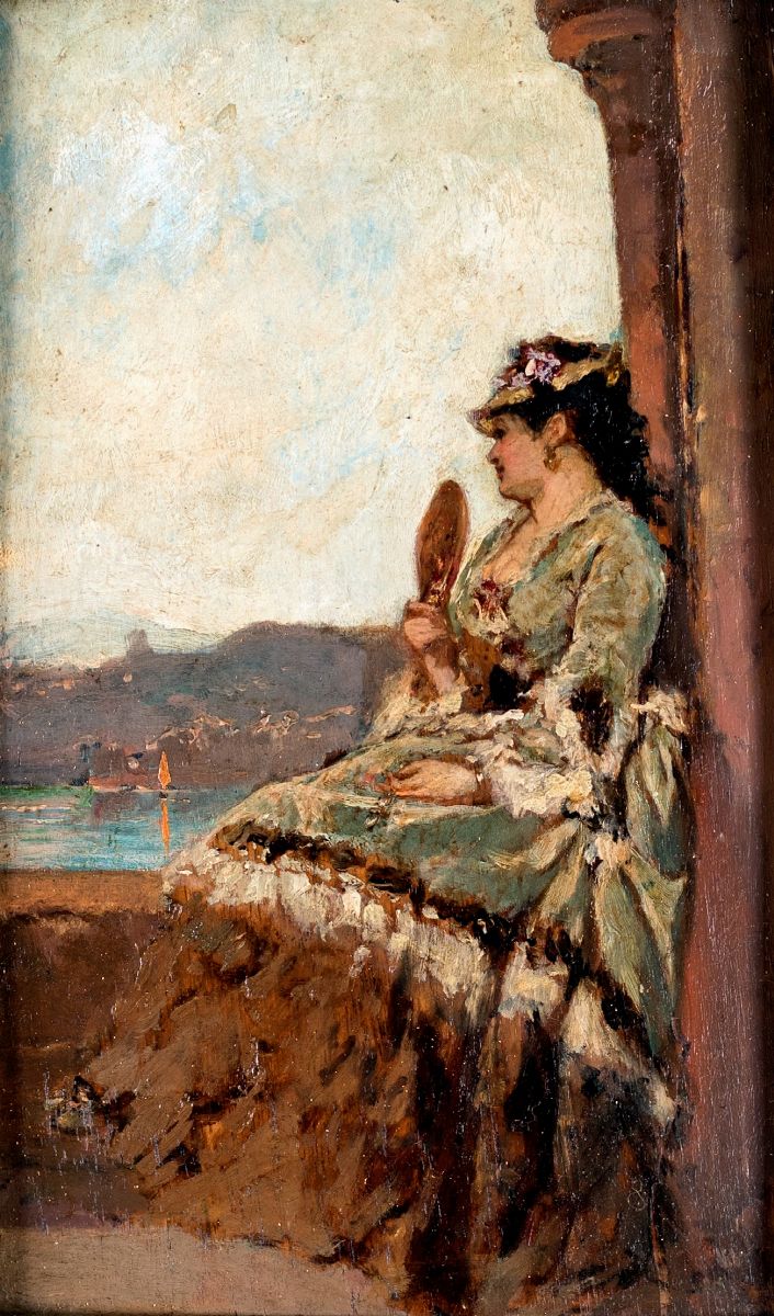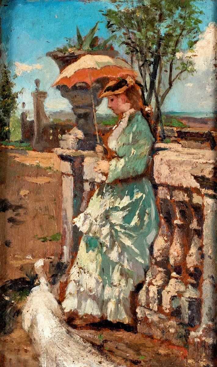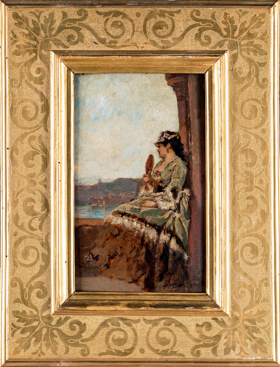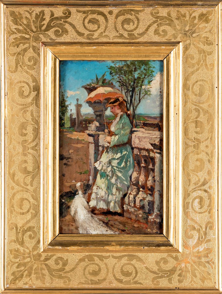 a) Figura femminile con ombrellino b) Donna con ventaglio