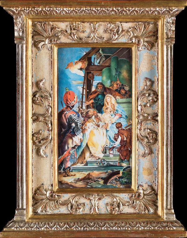 latamente ispirato al dipinto di Paolo Veronese. Firmato in basso a destra: O. Pattini entro cornice in forma di edicola in legno dipinto e dorato