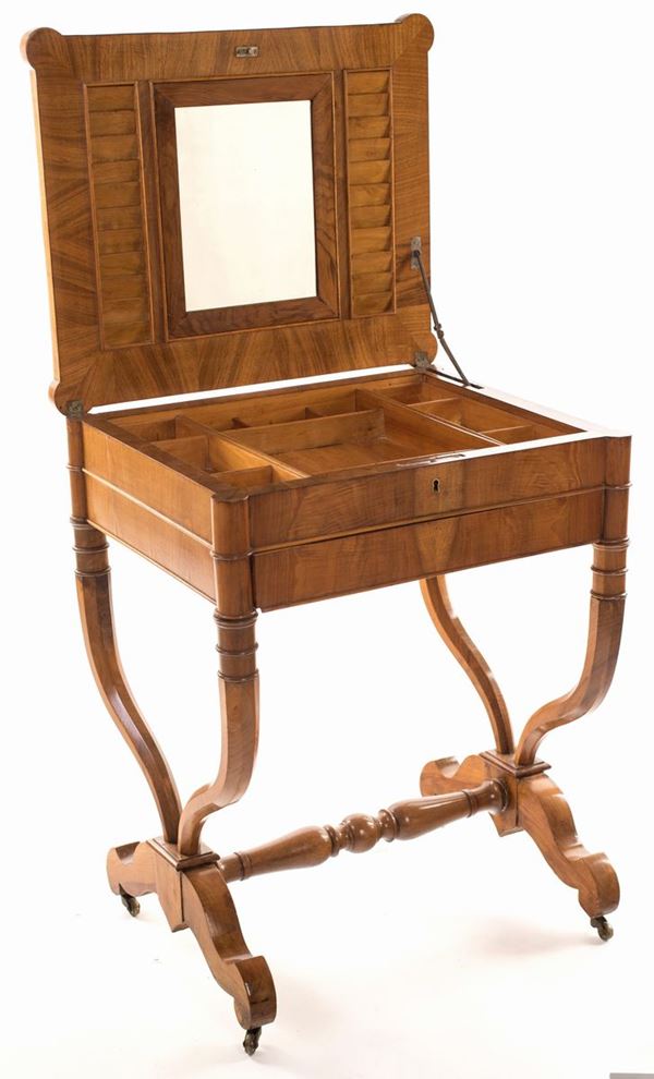 con sottili filettature in legno di frutto; piano rettangolare ad angoli prominenti arrotondati, incernierato, con specchio al verso delimitato da due portabiglietti e numerosi divisori interni di diversa misura; un cassetto nella fascia anch'esso suddiviso in scomparti, gambe incrociate riunite da traversa