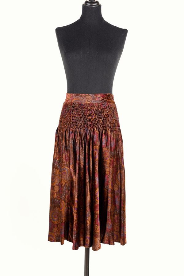 Completo composto da giacca e gonna. Ornato con punto smock. Manica raglan a palloncino, polsino con due bottoni. Gonna con chiusura nel centro dietro con gancetto e cerniera lampo. Ottimo stato di conservazione.