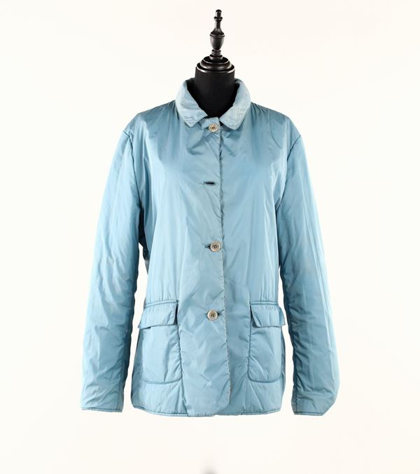 Double face utilizzabile nella versione con motivo tartan stampato sui toni del marrone, o in tinta unita celeste. Chiusura centrale con bottoni con inciso "Burberry". Nella variante in tartan tasche con patta cucita, mentre in quella celeste tasche a toppa con patta. Un bottone mancante e difetti.