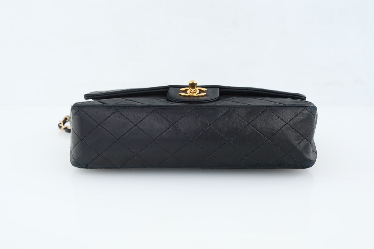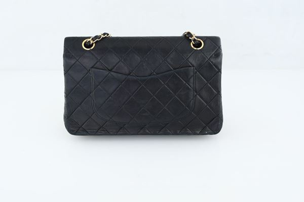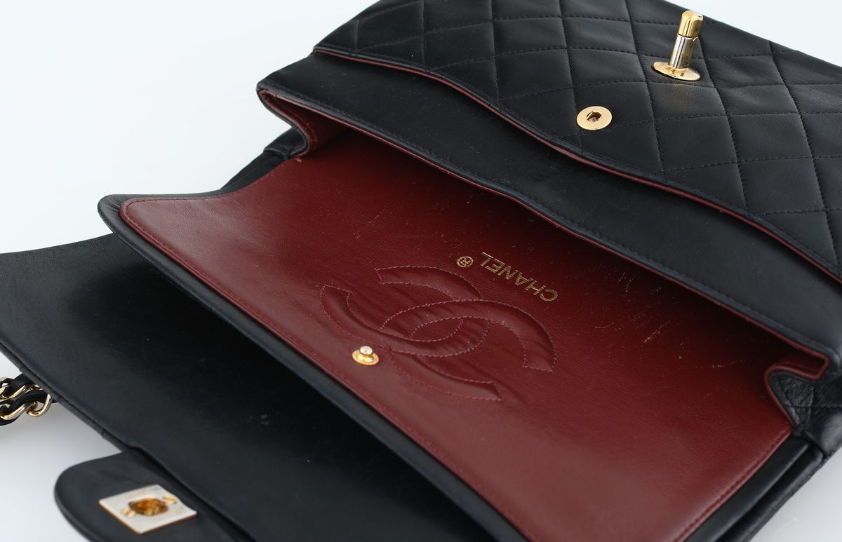 In pelle nera con motivo matelassé. Chiusura con monogram logo. Tasca sul retro. Internamente color borgogna con la classica suddivisione in scomparti e tasche. Tracolla color oro con inserto in pelle che la attraversa (54/90 cm). Presenta segni di utilizzo. Con dust bag originale (con difetto).