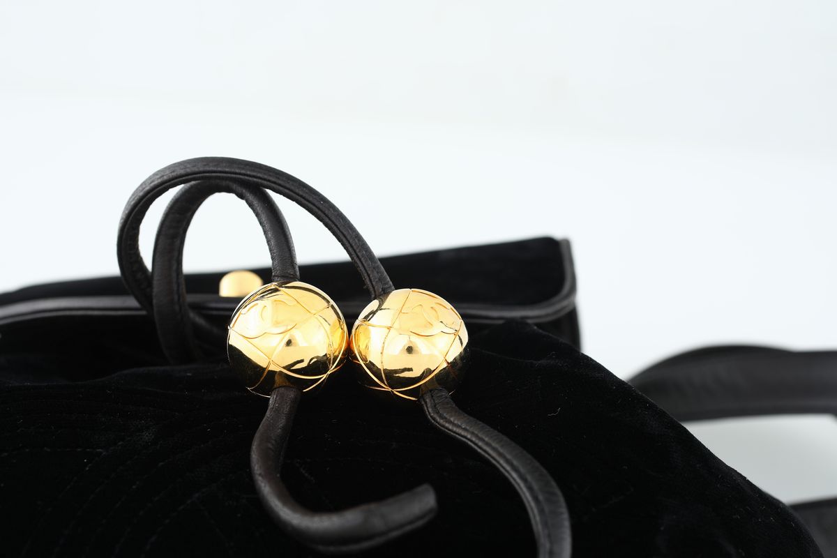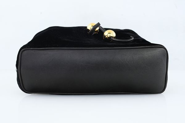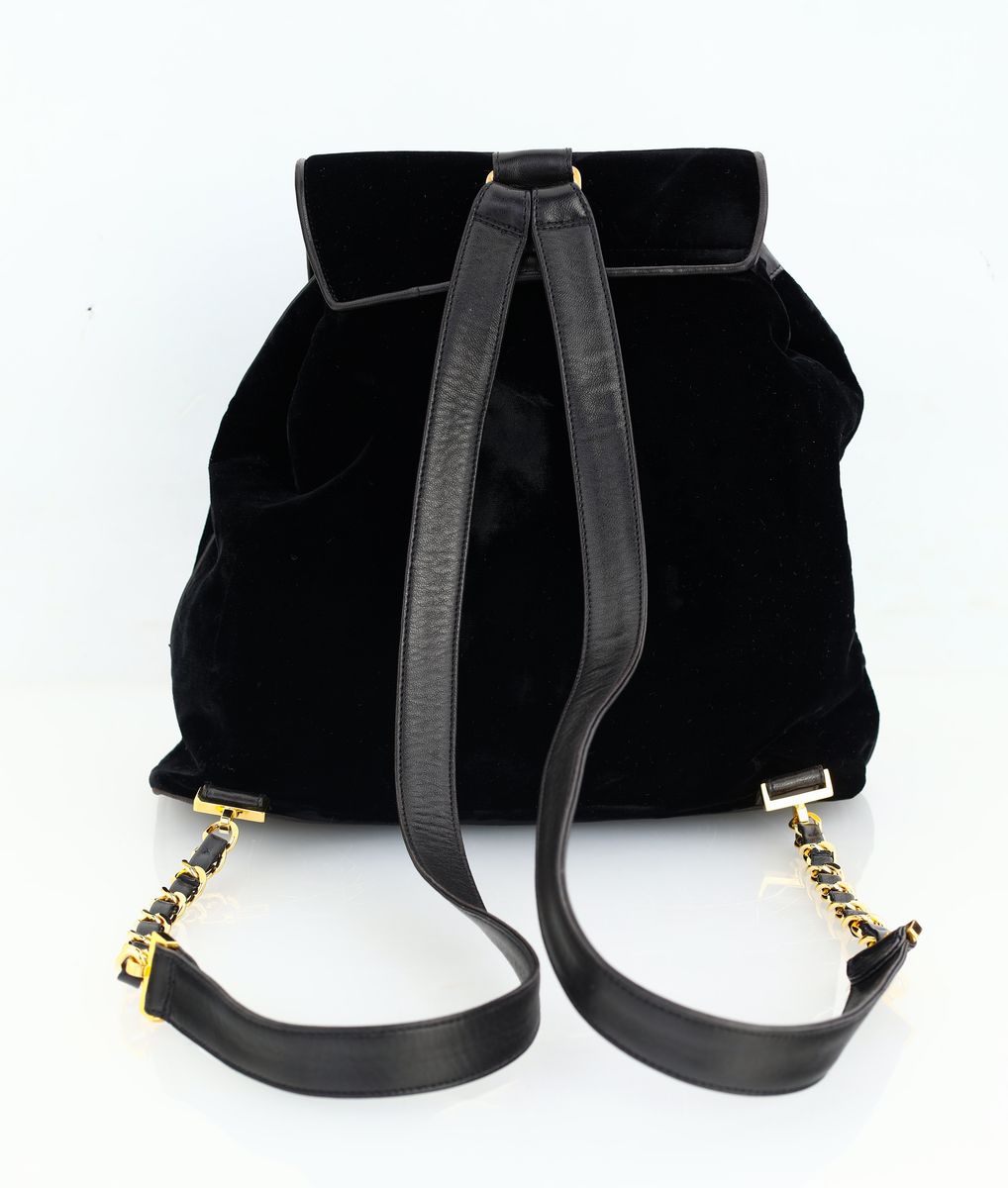In velluto nero e inserti in pelle con logo cc impunturato. Chiusura con cluisse regolabile e logo cc oro. Bretelle non regolabili (77 cm) in pelle e catena colo oro con inserto in pelle. All'interno tasca estraibile con chiusura lampo logata. Ottimo stato di conservazione.