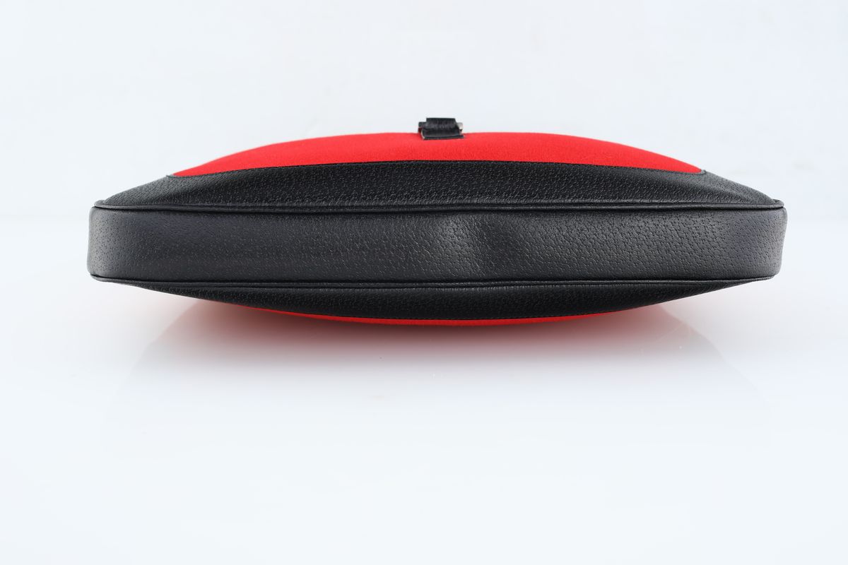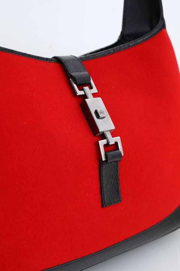 In tessuto rosso e pelle nera. Chiusura in metallo con logo. Manico con fibbia (50 cm). All'interno fodera nera con logo gucci, tasca inetrna con chiusura lampo. Ottimo stato di conservazione.