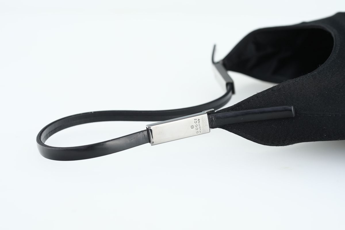 In raso nera. Manico con dettagli in metallo con inciso logo (28 cm) . La borsa non possiede chiusura, all'interno possiede una piccola tasca estraibile. Ottimo stato di conservazione.