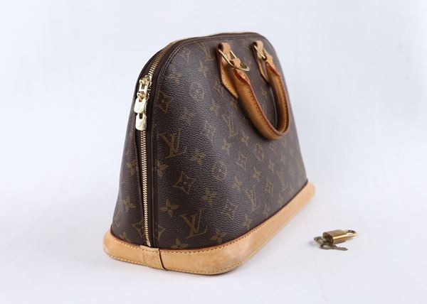 In tela monogram. Su uno dei due fronti, presenta le iniziali "EDL" incise. Dotata di lucchetto e chiavi originali. Ottimo stato di conservazione, segni di utilizzo sul fondo e sui manici.