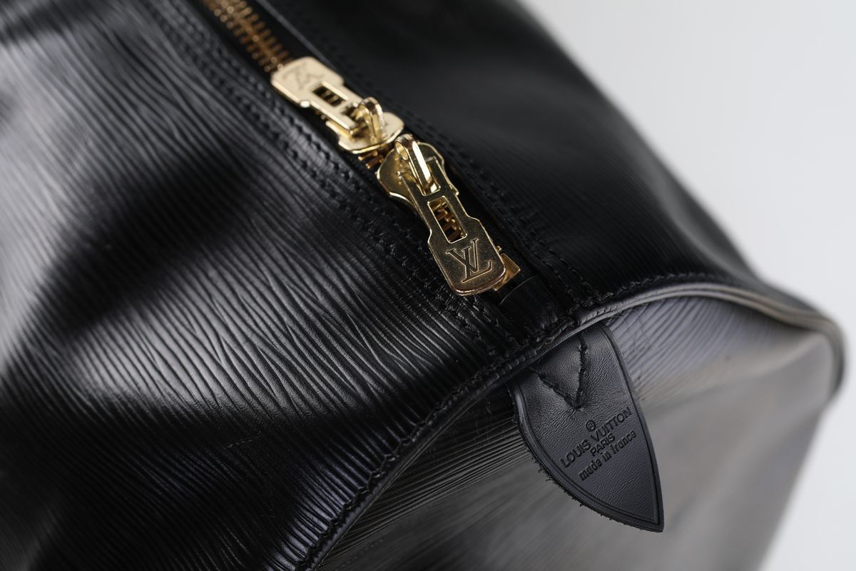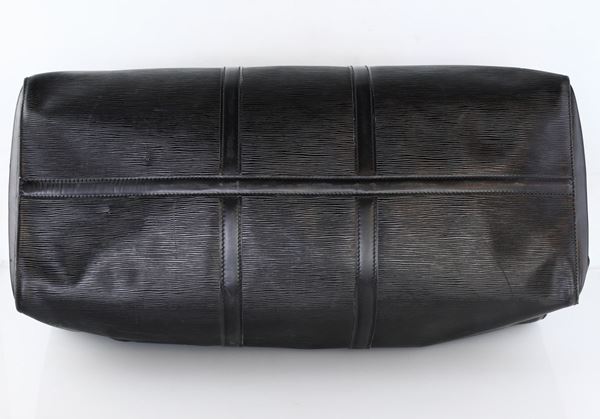 In pelle nera. Chiusura con doppio cursore dorato con monogram logo. Porte adresse amovibile di pelle. Tasca laterale. A scomparto unico. Lievi segni di utilizzo. Bulloncino per fissare manico mancante.