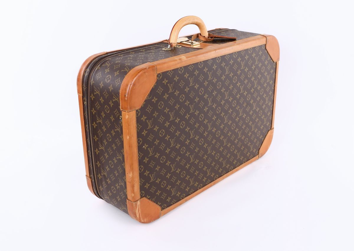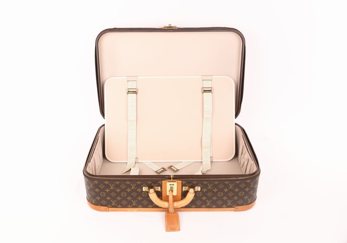 Valigia in tela monogram con finiture in pelle. Interno beige con due tasche elastiche a parete, cinture a doppia imbracatura Louis Vuitton. Chiusura con cerniera lampo e serratura a combinazione. Porte adresse amovibile di pelle. Presenta segni di utilizzo.