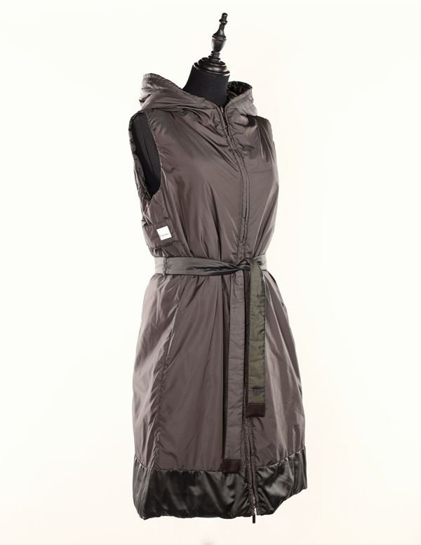 Taglia 44. Imbottitura in piumino vergine d'oca siberiana. Double face con cappuccio e tasche laterali. Chiusura lampo con doppio cursore. Cintura in vita (con difetto).