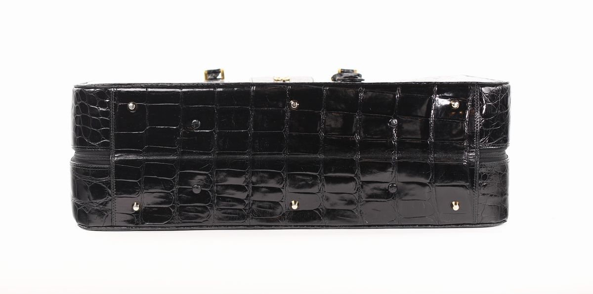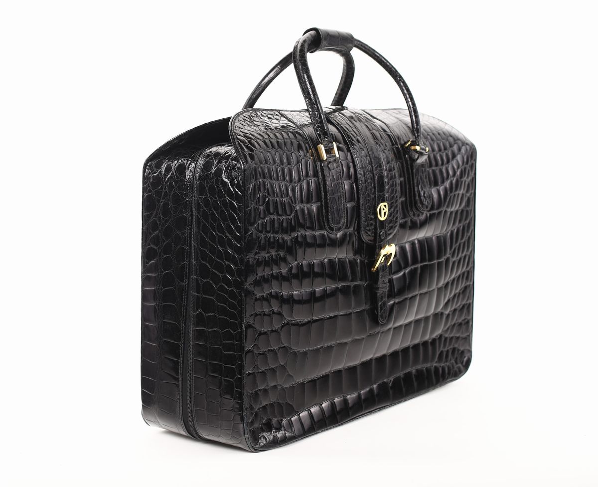 In pelle di coccodrillo. Chiusura con fibbia e lampo. Manici rigidi (54 cm). Con chiavi e lucchetto. Due tasche con chiusura lampo esterne. Internamente suddivisa in due scomparti, con due cinte a strappo per il fissaggio dei vestiti. Ottimo stato di conservazione.