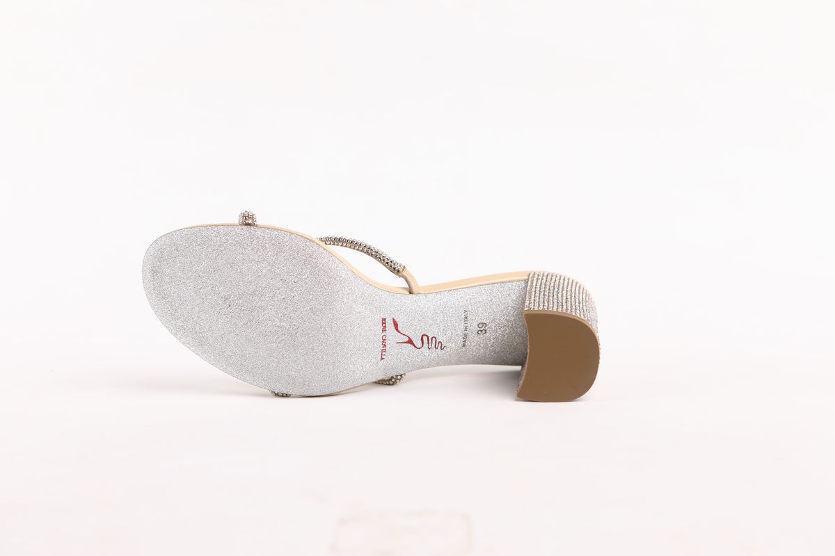 Tacco 8 cm. In pelle beige, fasce e tacco con strass, suola brillantinata color argento. Entro scatola originale con dust bag. Ottimo stato di conservazione, pari a nuovo.
