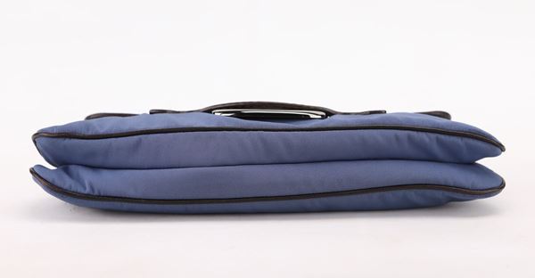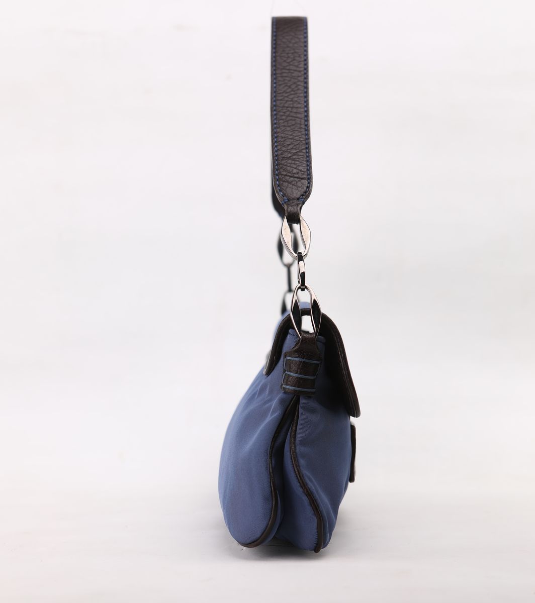 In tessuto con finiture in pelle. Manico (54 cm). Fibbia per chiusura con magnete. A scomparto unico e tasca con cerniera lampo. Ottimo stato di conservazione.