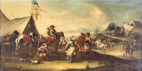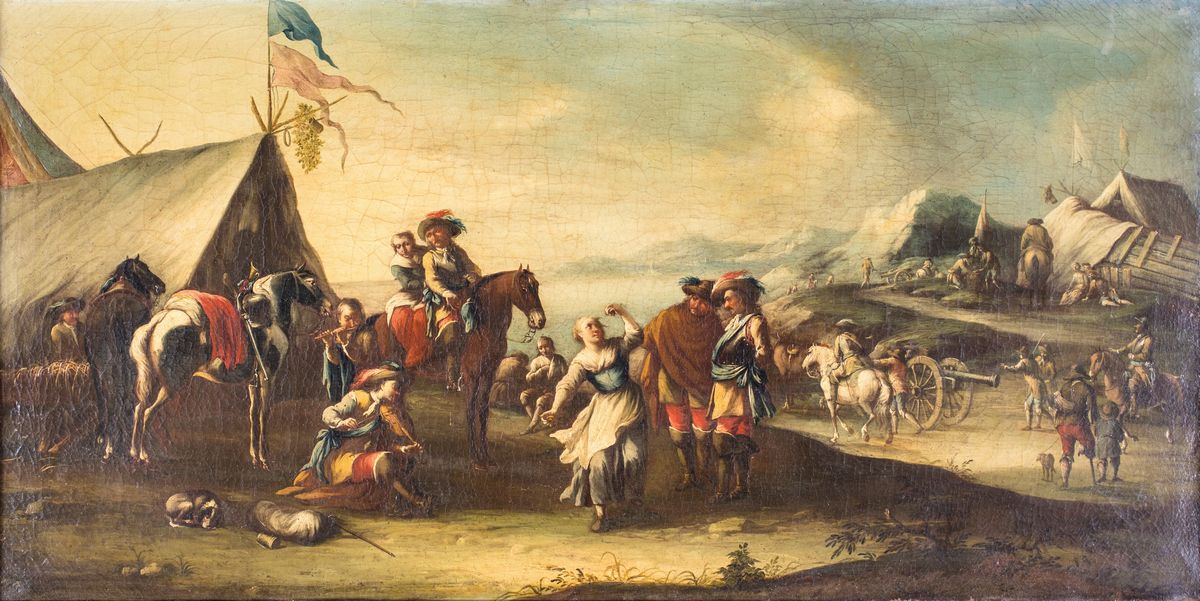 con soldati e donne che ballano e suonano davanti ad una tenda