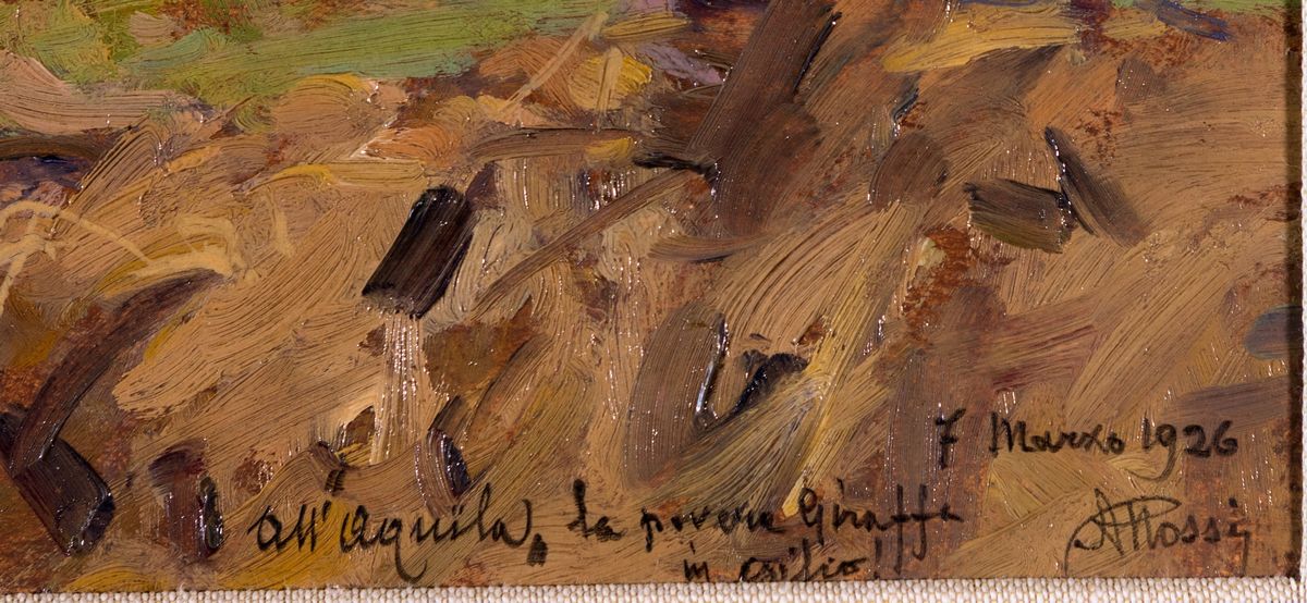 Dedica, firma e data in basso a destra: All'Aquila la povera Giraffa in esilio, 7 marzo 1926, A. Rossi