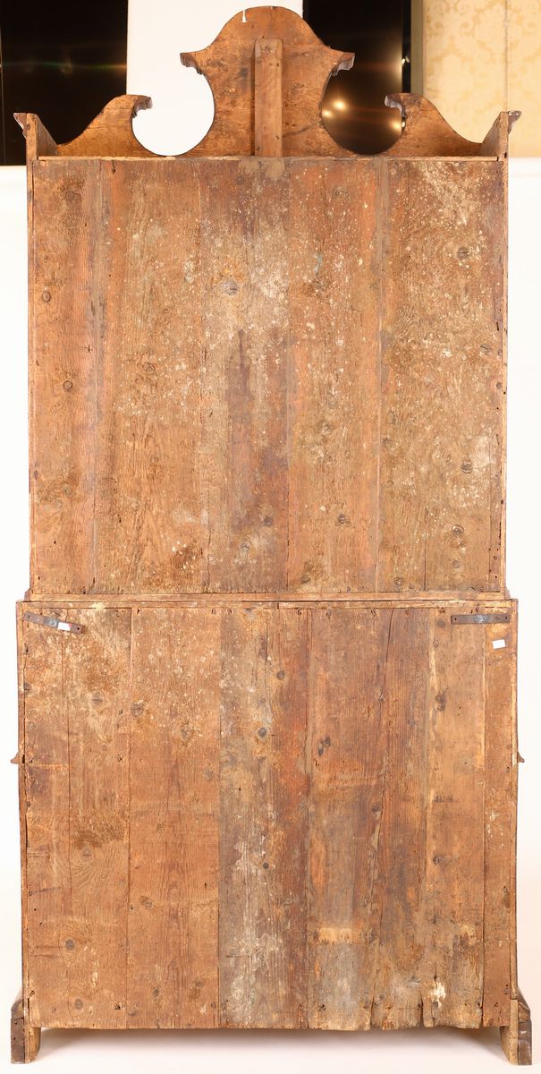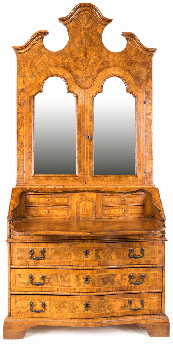 corpo superiore con cimasa a timpano spezzato e due ante a vetri, corpo inferiore con facciata lievemente sagomata suddivisa in tre cassetti con maniglie in bronzo sormontati da un'anta a ribalta che cela un'antina centinata affiancata da due tiretti simmetricamente disposti ai lati. Piedi a mensola
