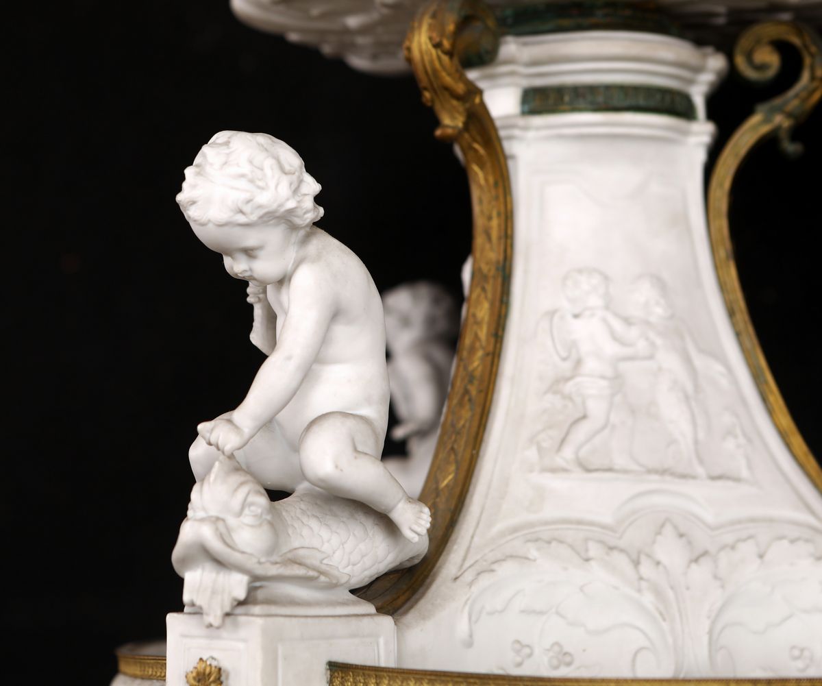 con coppa circolare emergente da una vasca abbellita da tre figure di amorino a cavallo di un delfino