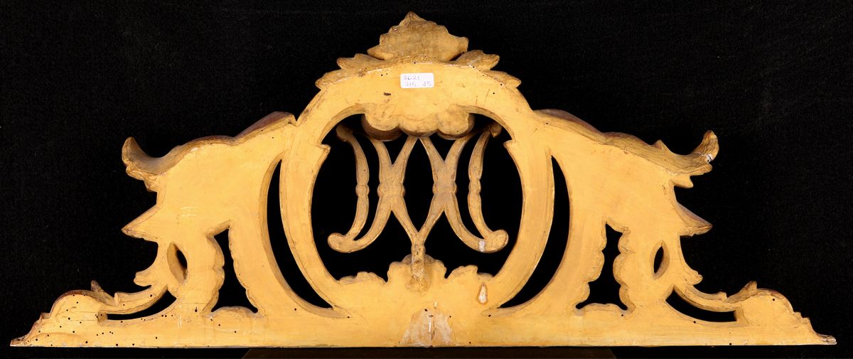 a forma di timpano spezzato abbellito da rilievi vegetali, centrato da M a giorno entro cartiglio