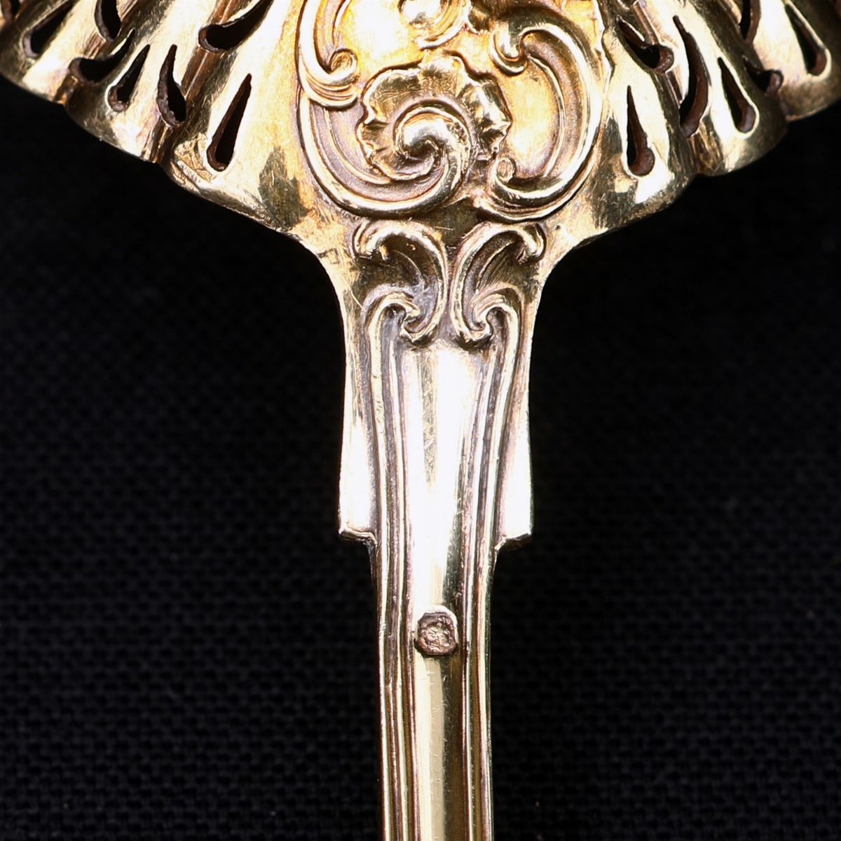 Dodici cucchiai da dessert e mestolo traforato in argento 950/1000 dorato, Francia, seconda metà del XIX secolo