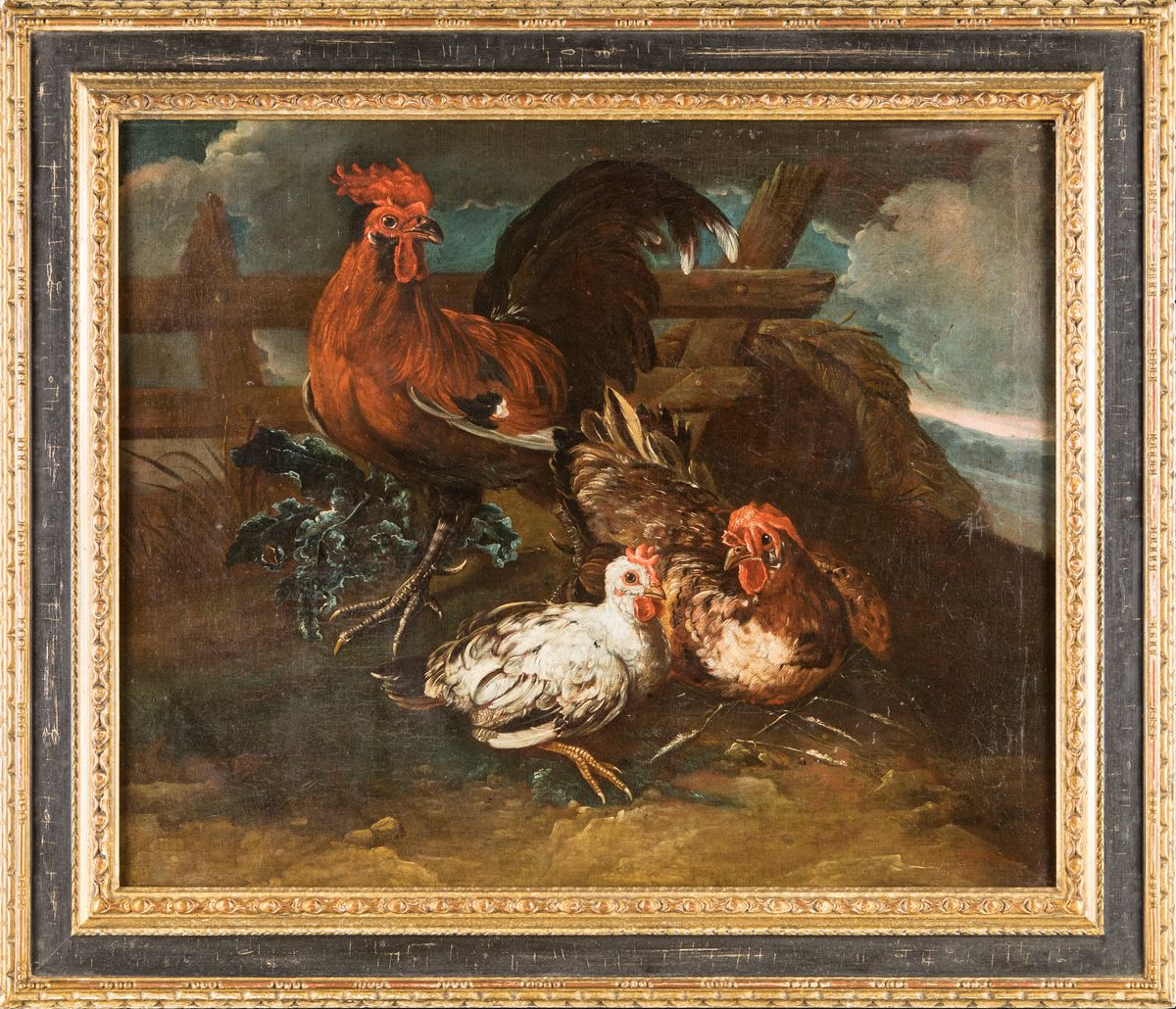 Al verso, etichetta su telaio con indicazione al pittore olandese seicentesco Melchior de Hondecoeter, o Hondecoutre, specializzato nella pittura di nature morte e animali