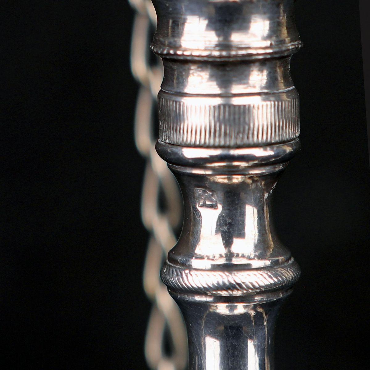 con fusto composito su cui poggia la vaschetta portaolio a tre beccucci in forma di volto di satiro; sulla sommità un vaso da cui discendono quattro catenelle con pinzette, smoccolatoio e spengi-fiamma; la sommità è rifinita da figura scultorea di cigno; piede circolare decorato da perline e palmette