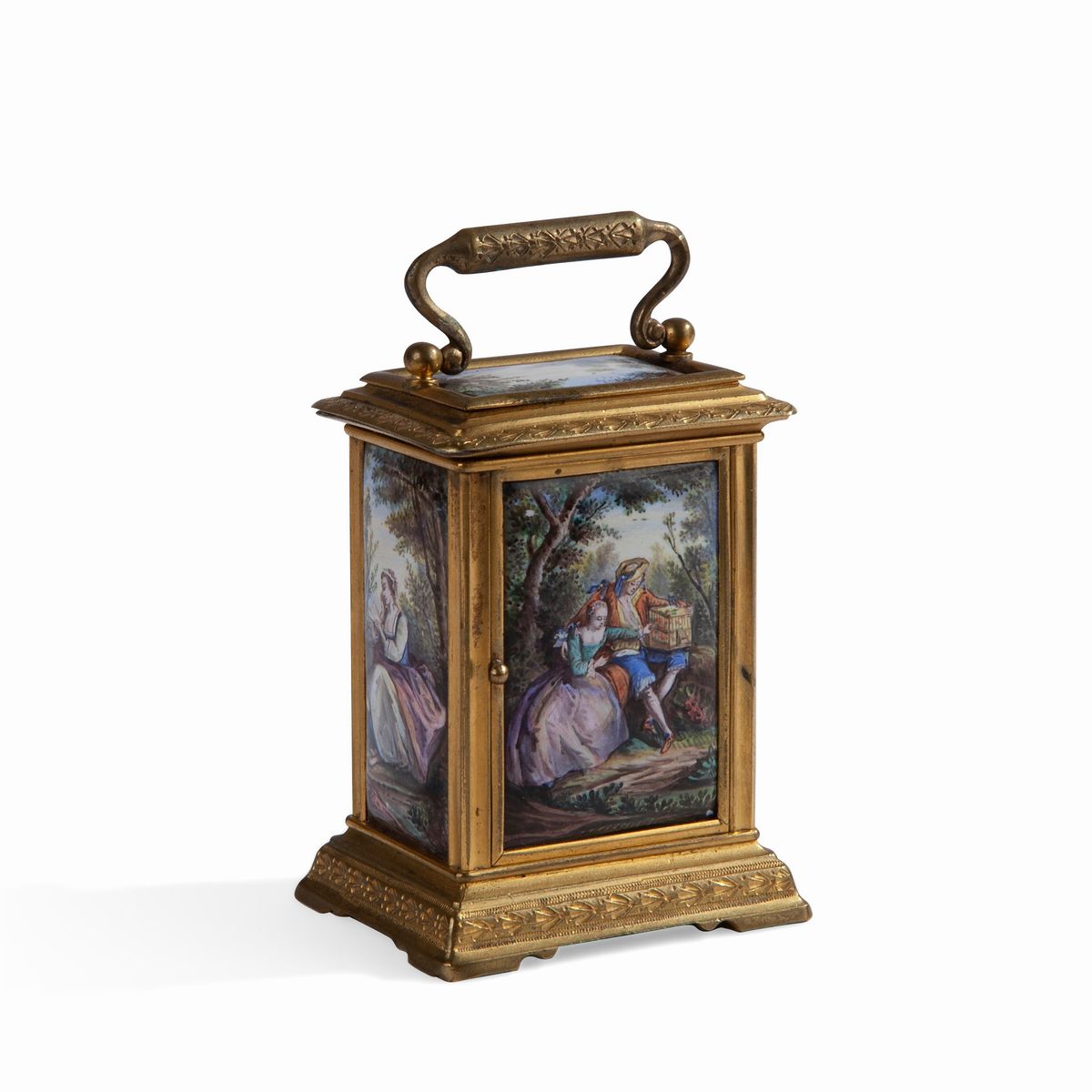 decorata da scene di genere su sfondo di paesaggio; quadrante circolare in smalto bianco con fascia oraria a numeri romani