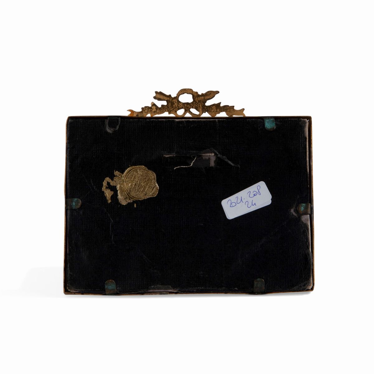 raffigurante i due angeli pensosi della Madonna Sistina di Raffaello; cornice in metallo dorato sormontata da un tralcio legato da un fiocco