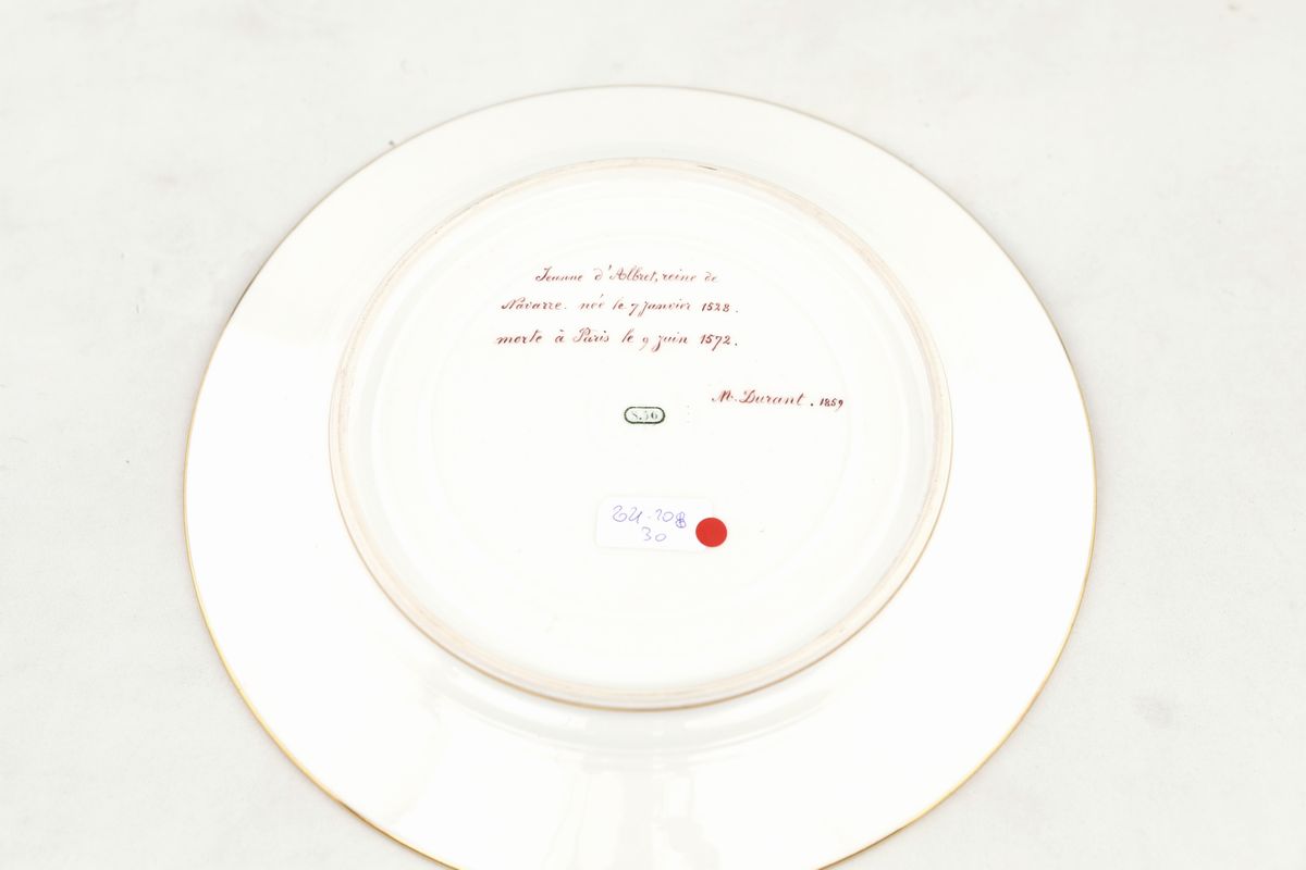 decorati ognuno con ritratti a mezzo busto di regine di Francia (Giovanna III di Navarra (Jeanne d'Albret), Maria Antonietta d'Austria e Francoise d'Aubigné) e di Inghilterra (Enrichetta Maria di Borbone-Francia, regina consorte di Inghilterra); tesa dorata con arabeschi lucidi su fondo verdino. Al verso di ogni piatto titolo, firma M. Durant e data (1859 (2), 1861 e 1863)