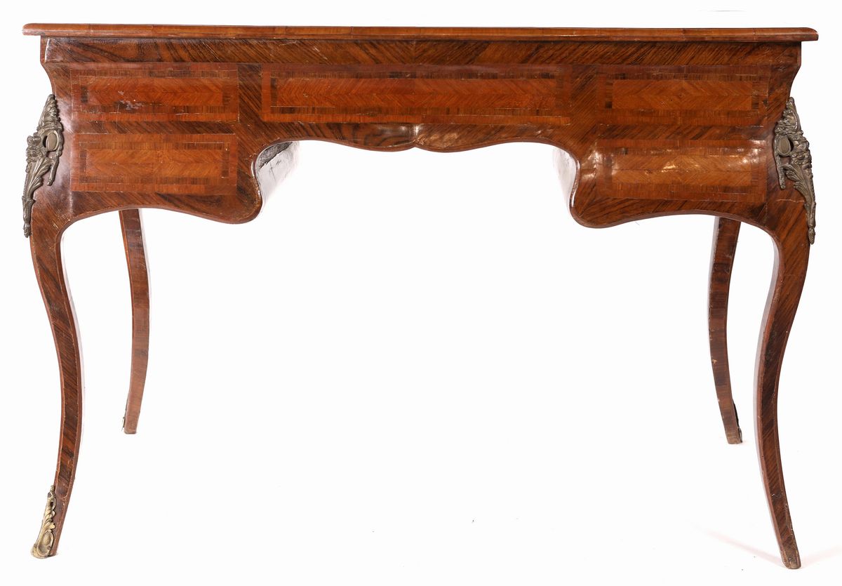 con piano e fianchi centrati da stelle intarsiate racchiuse entro filettature; fascia sagomata con tablette estraibile, tre cassetti allineati e due sottostanti laterali, gambe mosse guarnite da finiture in bronzo dorato. Difetti e sostituzioni.