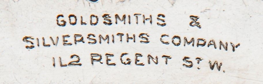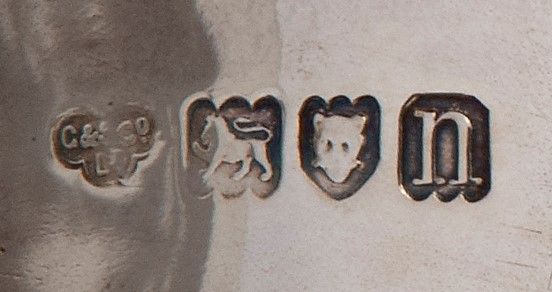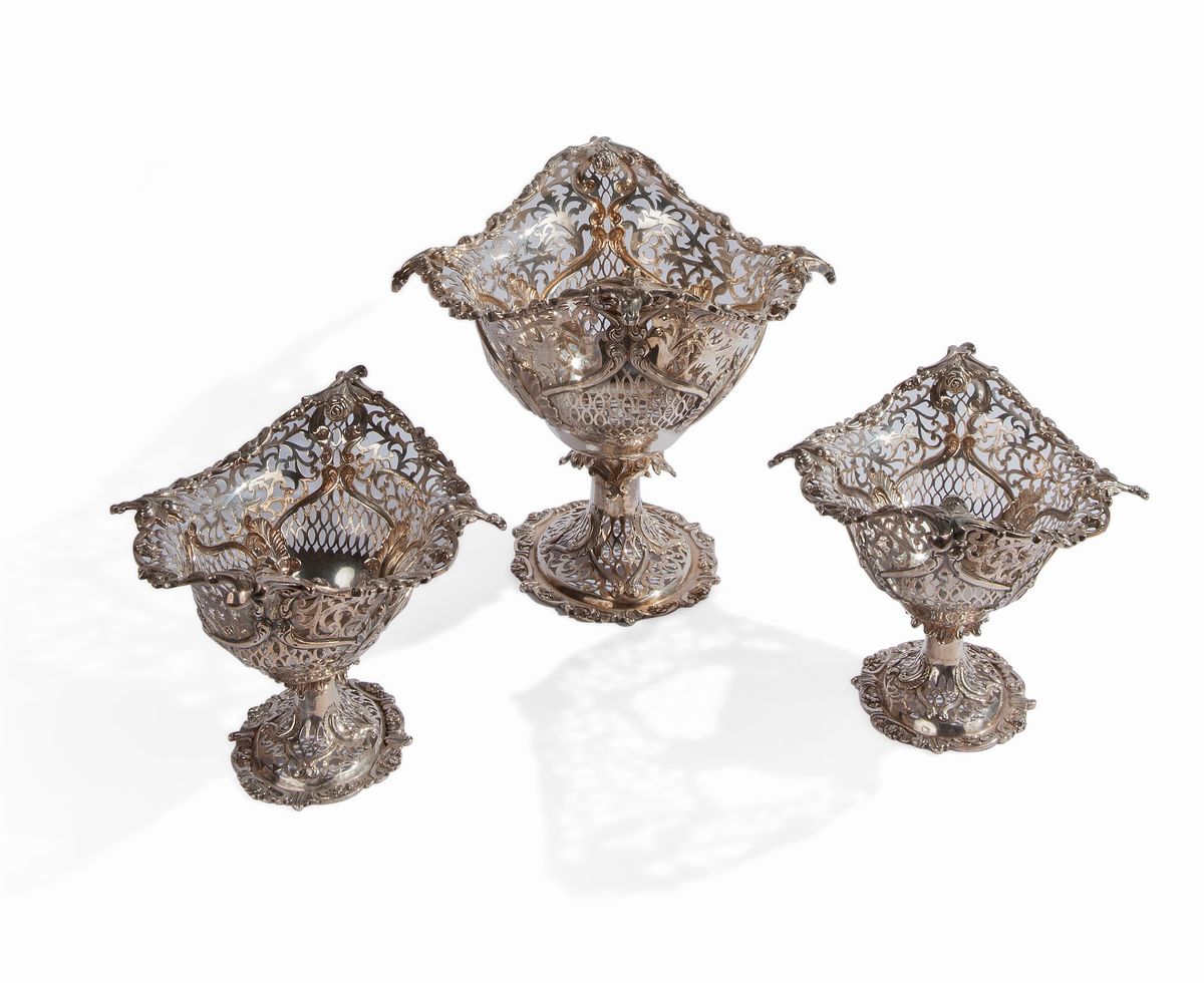 composto da tre coppe di cui una di misura maggiore, di forma ovale decorate a motivi vegetali e volute traforate e sbalzate; orli superiori ripiegati. Punzone degli argentieri Goldsmiths & Silversmiths Company, 142 Regent Street W sotto al piede della coppa principale