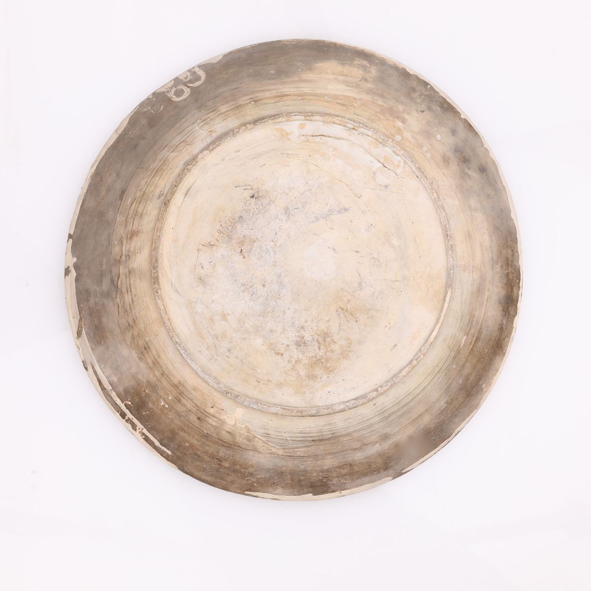 decorata al centro da un castello con albero su zolla di terra nei toni dell'ocra, del blu, del verde e del manganese; lungo il bordo festoni negli stessi colori. Una sbeccatura interna