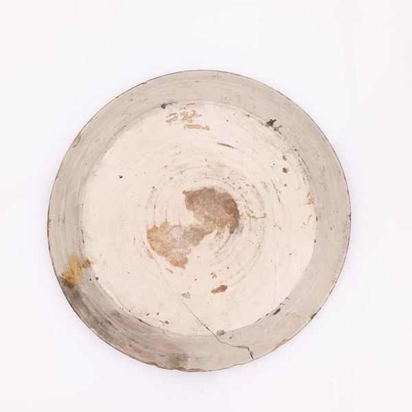 caratterizzata da un grande fiore centrale blu e rosso racchiuso da anelli giallo, ocra e manganese; bordura con serti fioriti blu. Rottura e cadute di smalto