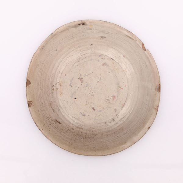 decorata con un ramo a due frutti nei toni del giallo, verde e manganese; bordo a motivi stilizzati nei medesimi toni cromatici; sbeccature