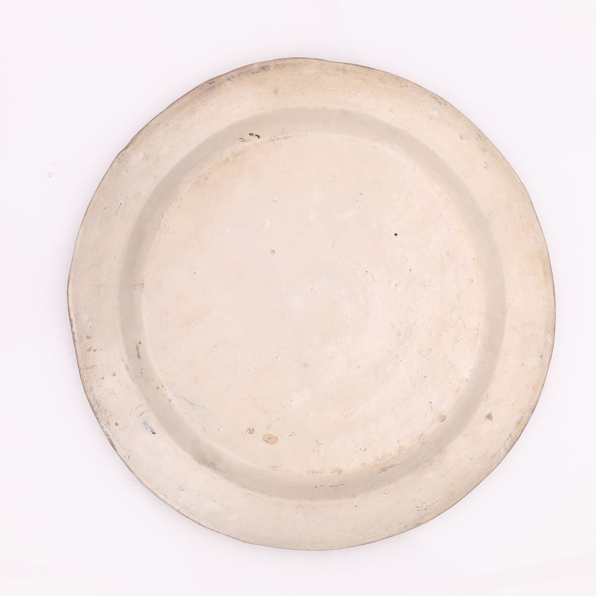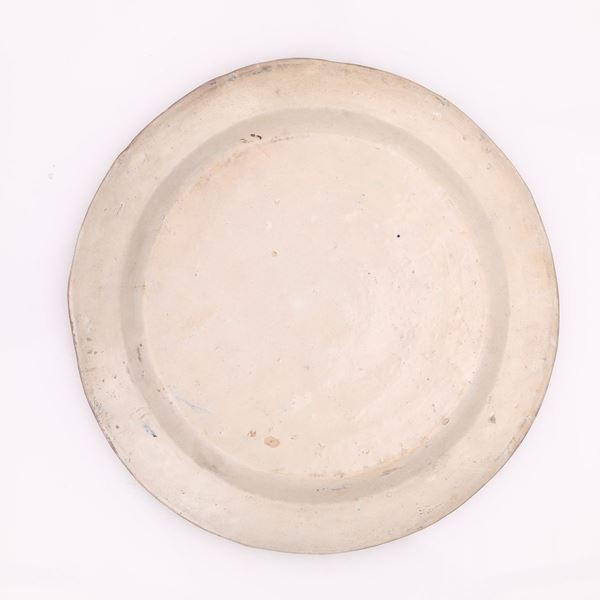 decorato in giallo e blu a cerchi concentrici; al centro motivi geometrici gialli e lungo la tesa ghirigori blu a stampino. Alcune sbeccature sul piatto