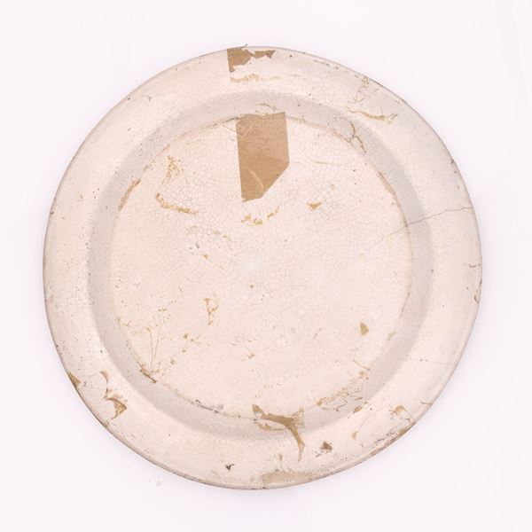 decorato a mascherina e pennello; al centro un grappolo d'uva su fondo cracquelé, tesa a fasce gialle e blu alternate decorata da archetti continui e contrapposti in manganese